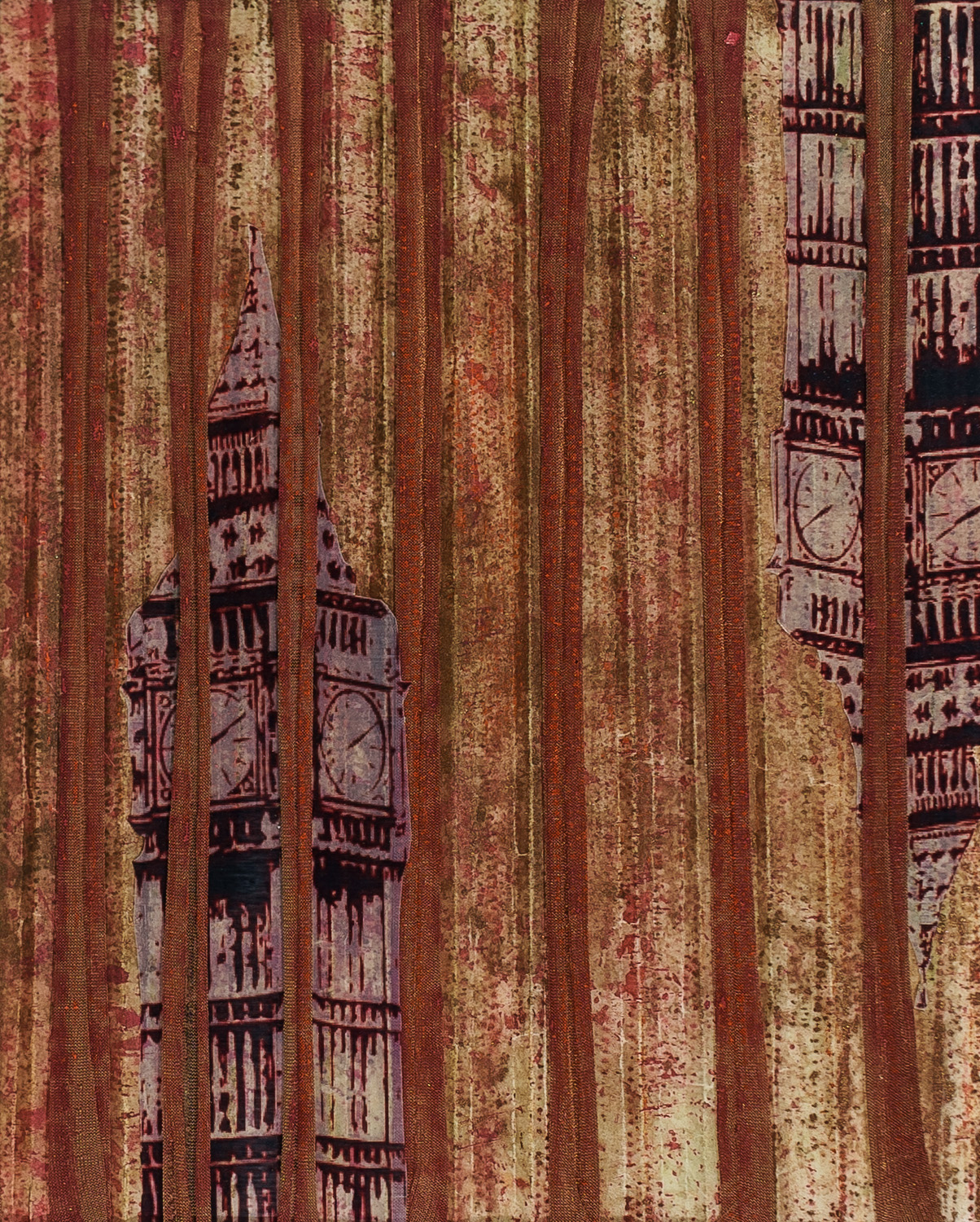 London's Burning: Wallcovering composed of wax, stretched nylon, reproductive image of Big Ben on acetate and metallic pigment on set paper.