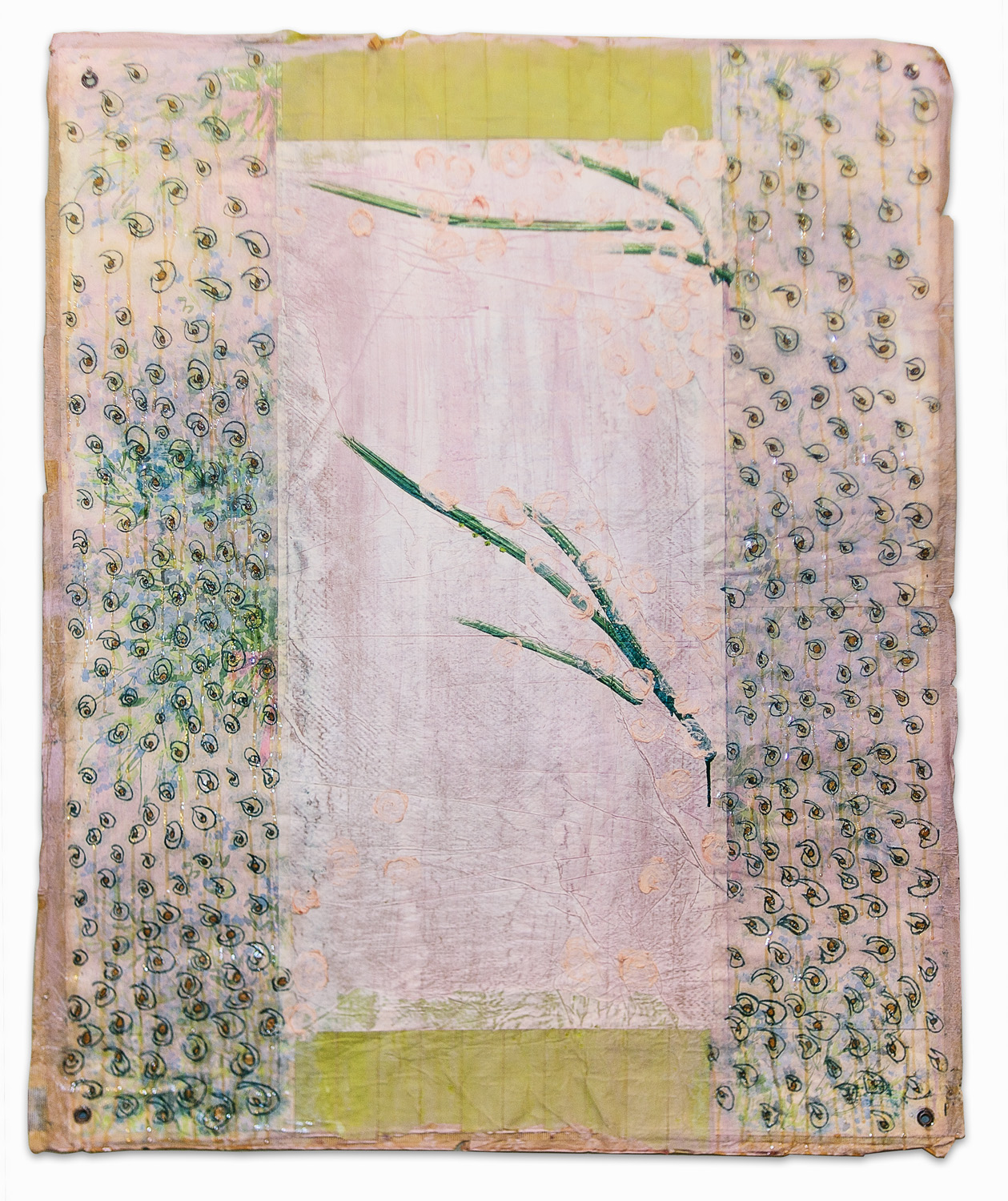 Spring: April Rains Epoxy, modeling paste and acrylic on vintage wallpaper 36" x 48"