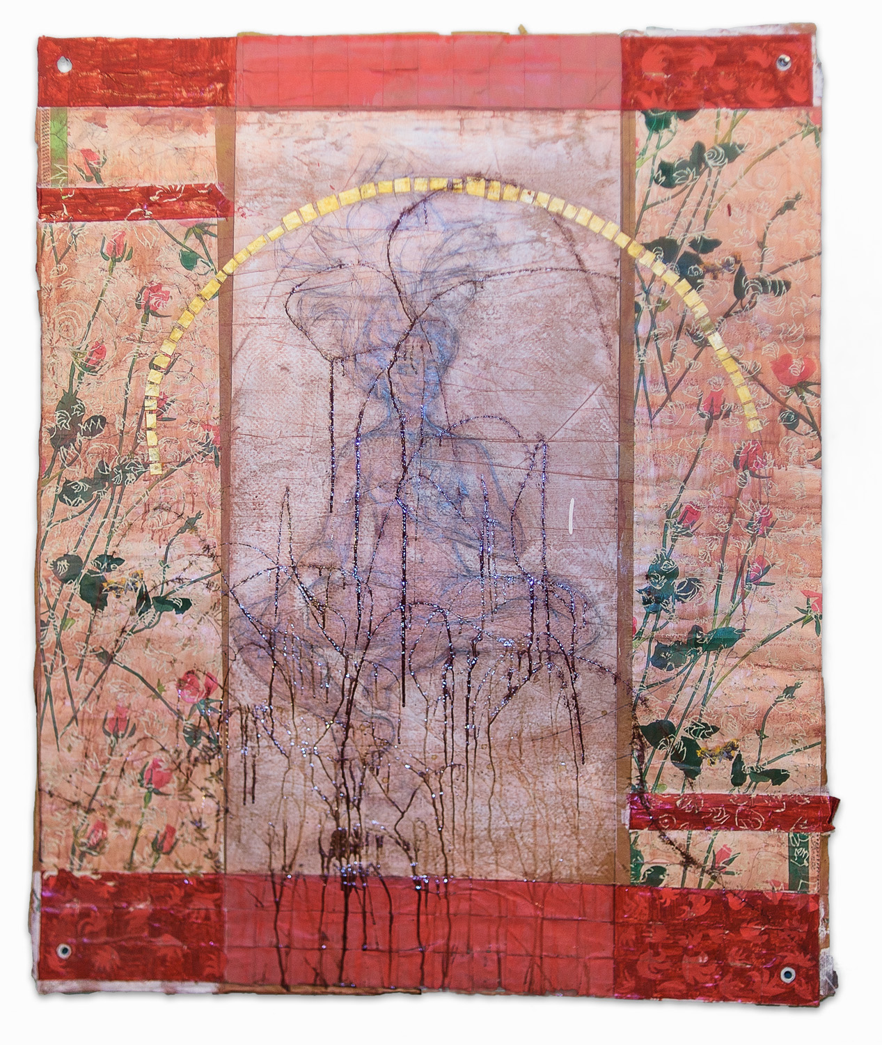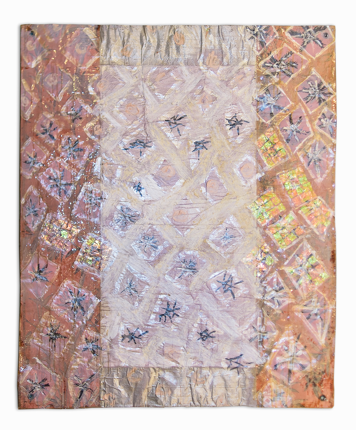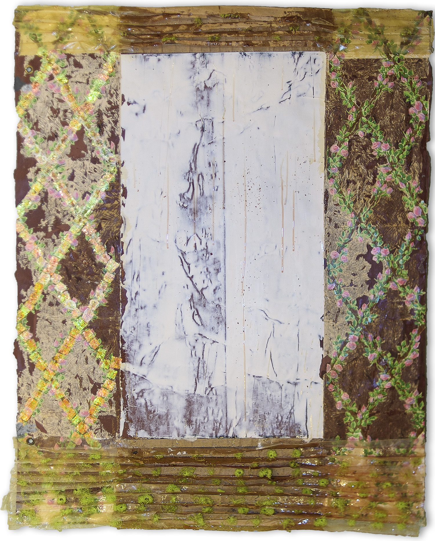 Fall: Window pains Modeling paste, epoxy, vintage wallpaper, iridescent mylar on set paper 36" x 48"